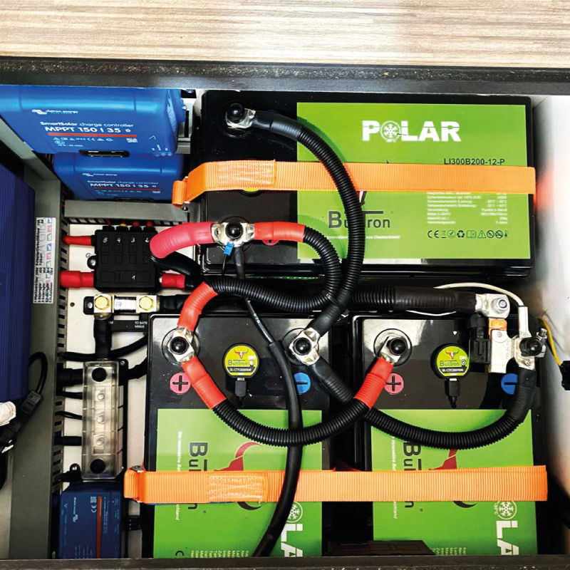 Neben herkömmlichen AGM Batterien erhalten moderne Lithium Batterien mit integriertem BMS mehr und mehr Einzug in autarke Reisemobile. Mit ihrer hohen Energiedichte haben sie ca. die 4 fache nutzbare Kapazität bei gleichem Gewicht im Vergleich zur AGM Technologie. Weitere Vorteile sind u.a. die lange Lebensdauer, die hohen Lade- und Entladeströme sowie die Smart-Funktionen (Bluetooth-Schnittstelle).
